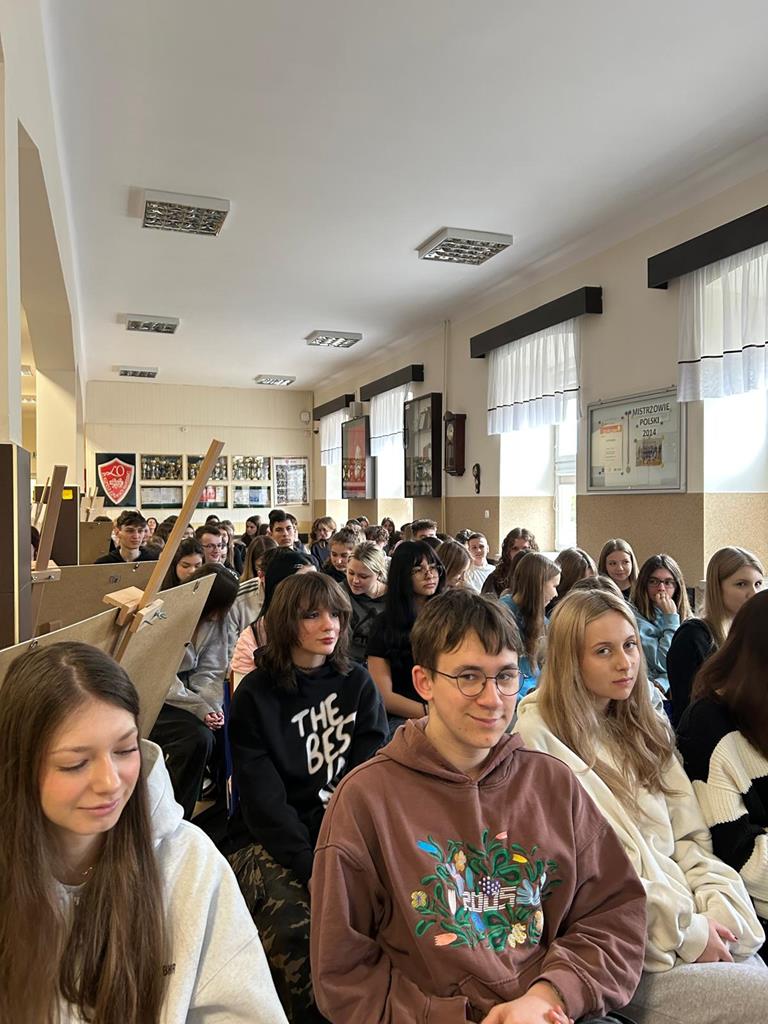 W sali widowiskowej zasiedli uczniowie naszego liceum – klasa: 1A, 1C, 2D, 2D1, 3B, 3C wraz z nauczycielami : Panią Katarzyną Bogacką ,Renatą Gałązką – Skowron, Renatą Korabiewską , Anetą Narożnicką oraz Anną Sęgą.
