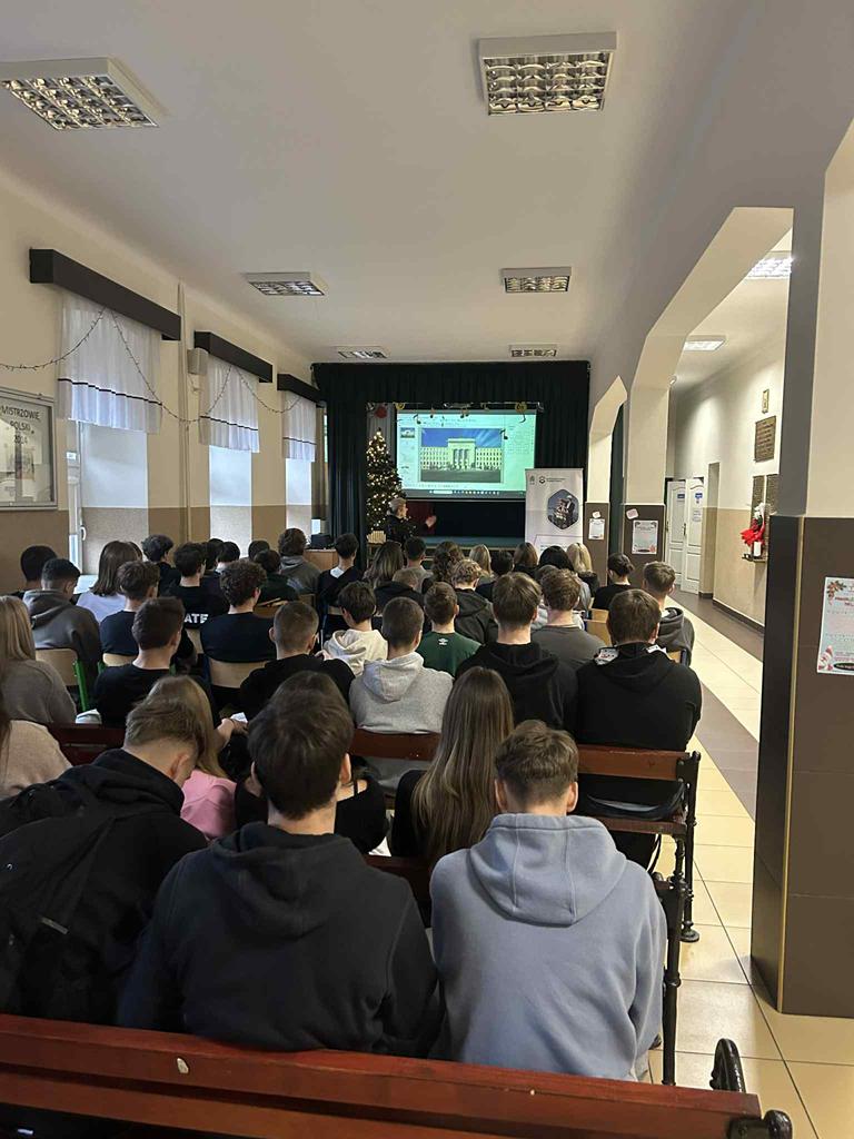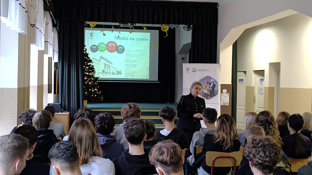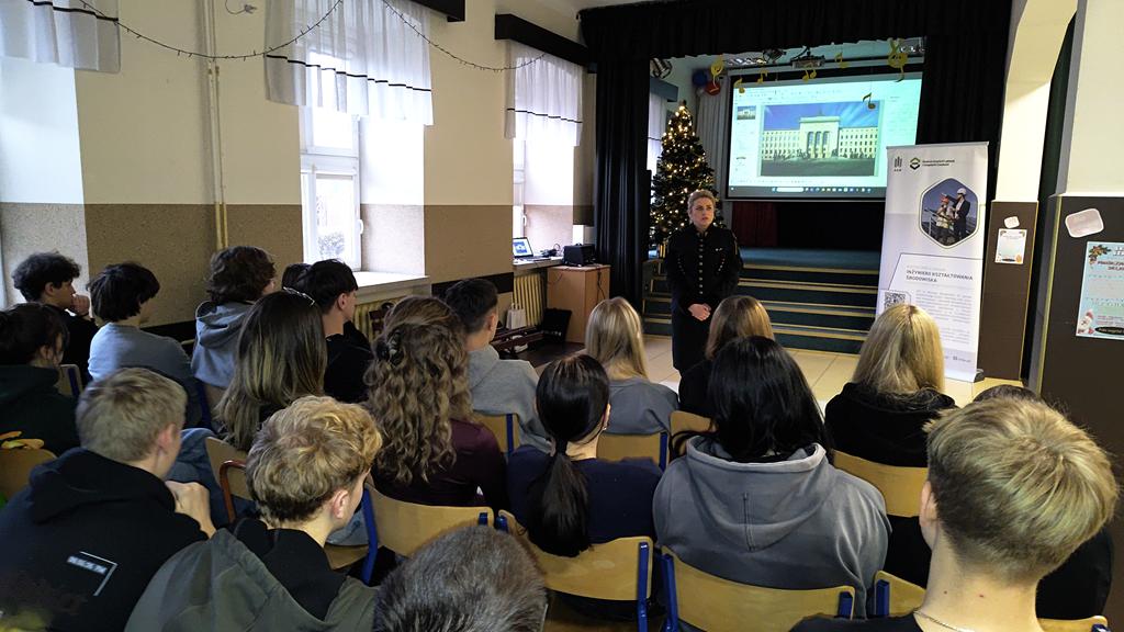 Przedstawicielka Wydziału Inżynierii Lądowej i Gospodarki Zasobami przeprowadziła prelekcję dotyczącą kierunków studiów, specyfiki kształcenia oraz możliwości rozwoju oferowanych przez wydział. Uczniowie poznali również propozycje warsztatów wyjazdowych dla młodzieży zainteresowanej tematyką inżynieryjną.
