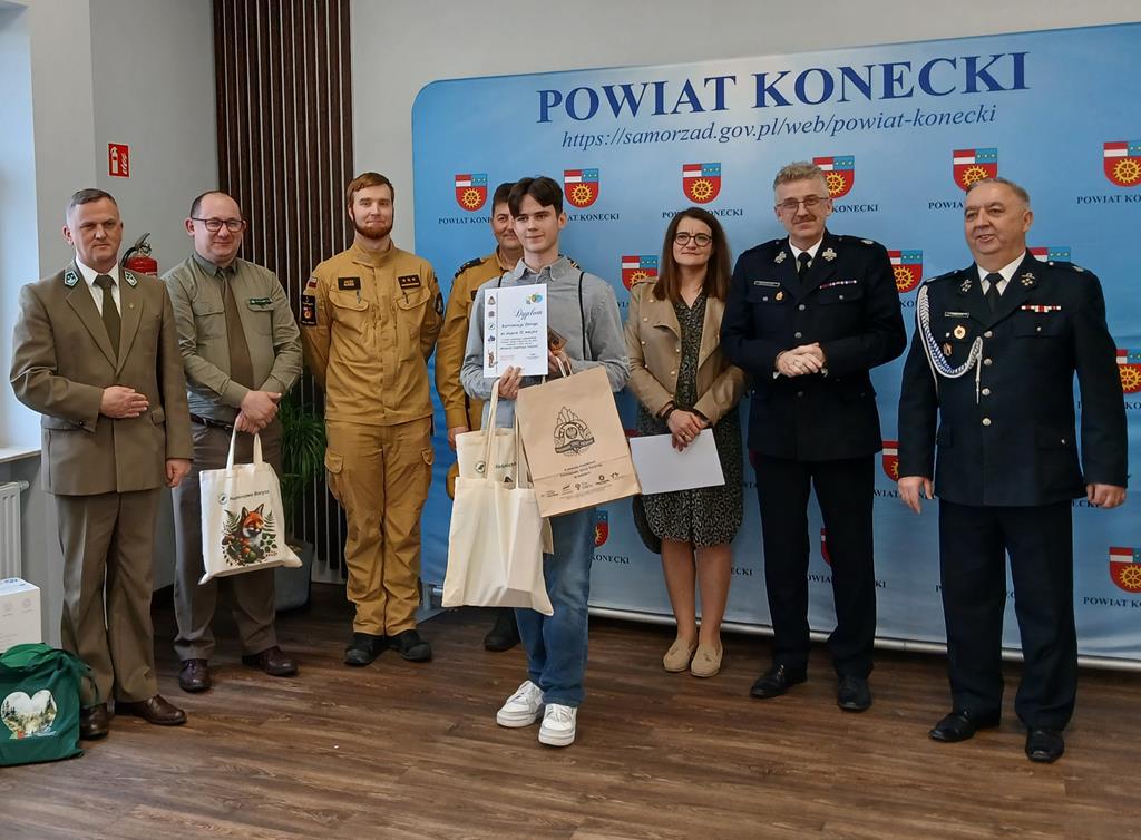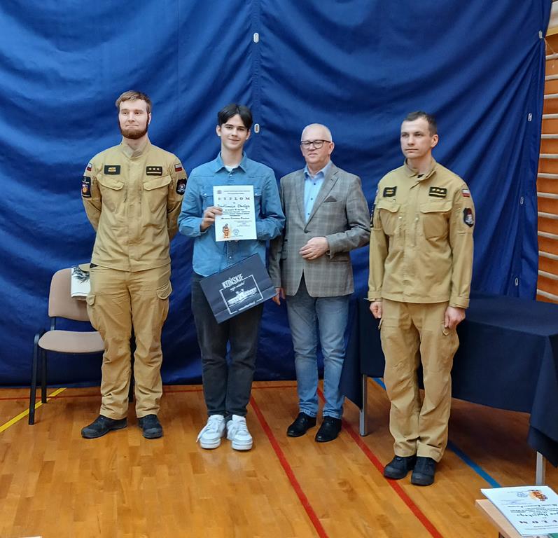 14 kwietnia 2026 r. w siedzibie Starostwa Powiatowego odbył się etap powiatowy tegorocznej edycji Ogólnopolskiego Turnieju Wiedzy Pożarniczej „Młodzież Zapobiega Pożarom”. Jednym z uczestników był nasz uczeń Bartłomiej Zbróg z klasy 1B, który uzyskał wcześniej najlepszy wynik podczas eliminacji szkolnych oraz zajął drugie miejsce w eliminacjach miejsko-gminnych w Końskich i tym samym zakwalifikował się do etapu powiatowego. Po pierwszej części Turnieju, jaką był test, Bartek zajmował 1 miejsce, jednak w dogrywce zabrakło mu nieco szczęścia i ostatecznie zajął drugie miejsce. Za udział otrzymał dyplom oraz upominki, które wręczone zostały przez przedstawicieli organizatorów Turnieju, czyli Starostwa Powiatowego, Związku Ochotniczych Straży Pożarnych Rzeczypospolitej Polskiej oraz Lasów Państwowych. Serdecznie gratulujemy wspaniałego wyniku!