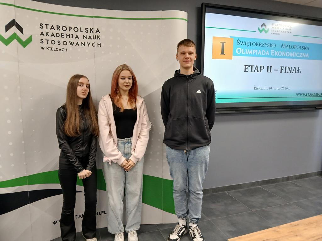 W dniu 30 marca 2026 r. w siedzibie Staropolskiej Akademii Nauk Stosowanych w Kielcach odbył się II etap (finałowy) I edycji Świętokrzysko-Małopolskiej Olimpiady Ekonomicznej. Udział wzięło prawie 30 uczniów ze szkół ponadpodstawowych z województwa świętokrzyskiego i małopolskiego, którzy osiągnęli najlepsze wyniki podczas I etapu Olimpiady. Naszą szkołę reprezentowała trójka uczniów, którzy najlepiej poradzili sobie z pytaniami z etapu szkolnego, który odbył się 9 marca: Klaudia Dąbrowska, Kinga Obarzanek i Wojciech Jędrasik – wszyscy z klasy 3A. Podczas finałowego etapu uczestnicy musieli się zmierzyć z testem składającym się z 50 pytań z dziedziny ekonomii. Za udział nasi uczniowie otrzymali dyplomy oraz drobne upominki.