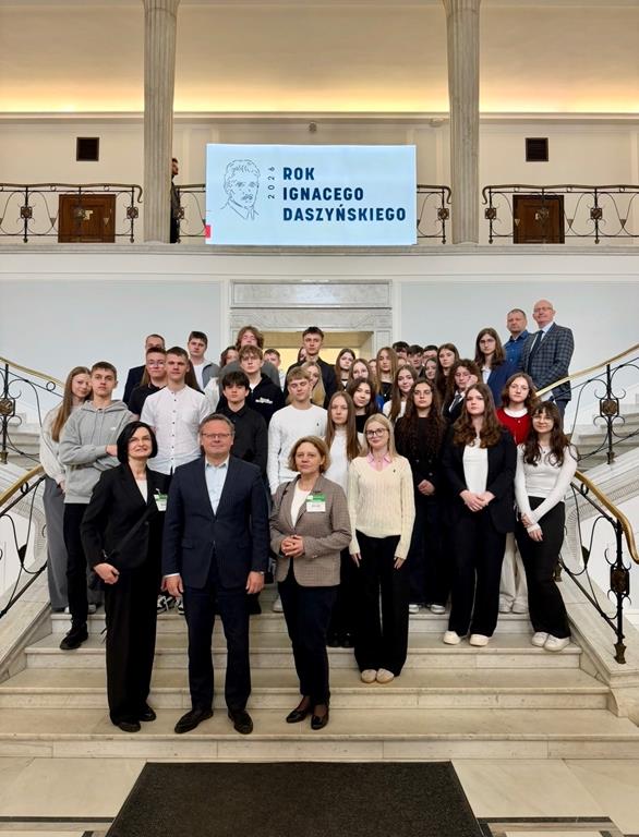 W dniu 26.03.2026 r. uczniowie naszej szkoły uczestniczyli w wyjątkowej wycieczce do Sejmu Rzeczypospolitej Polskiej na zaproszenie Posła na Sejm, Pana Andrzeja Szejny. W wyjeździe wzięło udział 47 uczniów. Podczas pobytu młodzież zwiedziła Salę Posiedzeń, kuluary oraz słynny Hall Główny. Tam obejrzała pamiątkowe tablice poświęcone zmarłym parlamentarzystom, a także wystawę zdjęć z Łodzi. Przewodnik przybliżył dzieje siedziby władzy ustawodawczej oraz zaprezentował m.in. historyczne laski marszałkowskie. Szczególnym punktem wizyty było spotkanie z Panem Wiceministrem Andrzejem Szejną, który opowiedział o codziennej pracy posła. Zachęcał uczniów do systematycznej nauki oraz rozważenia w przyszłości drogi parlamentarnej. Wycieczka była cenną lekcją wiedzy o funkcjonowaniu państwa i inspiracją do aktywnego uczestnictwa w życiu publicznym.